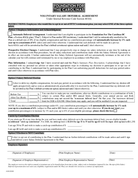 Employees that do not make a voluntary election to contribute will be automatically enrolled in the Plan at  a pre-tax deferral rate of 2% of pay. Employees have the option at any time to elect a different deferral  rate, choose Roth instead of pre-tax, or elect not to contribute to the Plan at all.